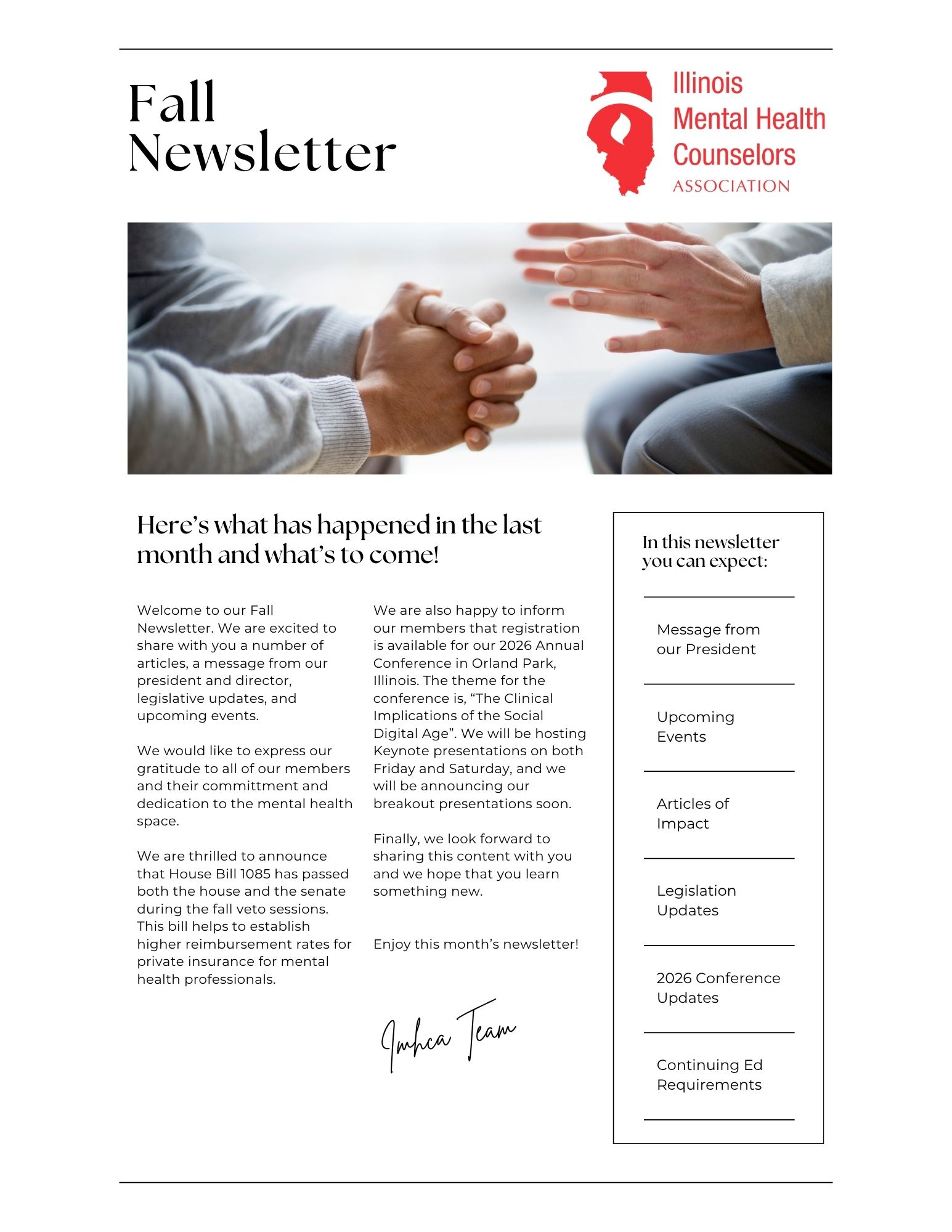 To view our latest newsletter, login to your member account and go to the "Resources" dropdown, then to "File Archive". Please reach out to the office at myimhca@gmail.com with any questions!